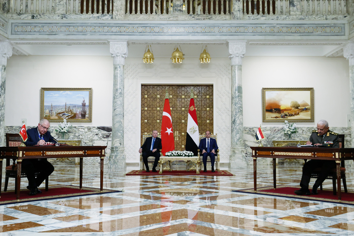 Egypt and Turkey signed a military cooperation agreement in Cairo on Wednesday, in the presence of Egyptian President Abdel Fattah al-Sisi and Turkish President Recep Tayyip Erdogan. The signing took place after talks between the two leaders in the Egyptian capital, during which several cooperation agreements were concluded. The most prominent was described as a “framework military agreement” between the two governments. The agreement was signed by Egypt’s Minister of Defence, Lieutenant General Abdel Meguid Saqr, and Turkey’s Minister of Defence, Yaşar Güler. Earlier in the day, Sisi and Erdogan co-chaired the second meeting of the High-Level Strategic Cooperation Council between Egypt and Turkey, at the conclusion of which the two presidents signed a joint statement. Erdogan was received by