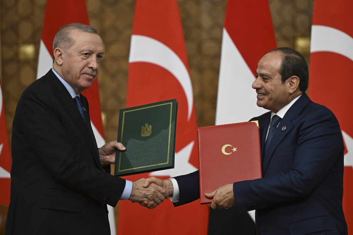 Egypt and Turkey signed a military cooperation agreement in Cairo on Wednesday, in the presence of Egyptian President Abdel Fattah al-Sisi and Turkish President Recep Tayyip Erdogan. The signing took place after talks between the two leaders in the Egyptian capital, during which several cooperation agreements were concluded. The most prominent was described as a “framework military agreement” between the two governments. The agreement was signed by Egypt’s Minister of Defence, Lieutenant General Abdel Meguid Saqr, and Turkey’s Minister of Defence, Yaşar Güler. Earlier in the day, Sisi and Erdogan co-chaired the second meeting of the High-Level Strategic Cooperation Council between Egypt and Turkey, at the conclusion of which the two presidents signed a joint statement. Erdogan was received by -