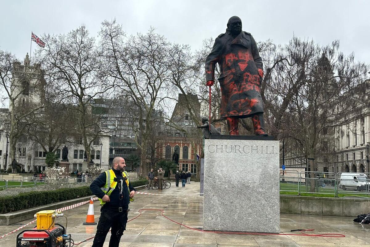 The statue of Winston Churchill in Parliament Square in Westminster was defaced overnight with the words “Zionist war criminal”, Anadolu reports. A 38-year-old man has been arrested on suspicion of “racially aggravated criminal damage” and remains in custody. Other phrases, including “Stop the Genocide” and “Free Palestine,” were sprayed in red paint on the bronze sculpture. Further graffiti read “Never again is Now” and “Globalise the Intifada.” The Dutch group Free the Filton 24 claimed responsibility for the action on Friday morning. It posted a video on its Instagram account, appearing to show a man dressed in red coveralls, with “I support Palestine Action” written on the back, painting the statue. Free the Filton 24 defines itself as a group of “family -