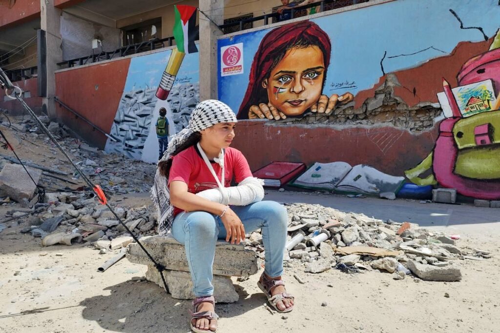 A graffiti on a wall in the southern Gaza city of Khan Yunis depicting Palestinian children deprived of education by Israel is viewed, on 14 June 2024 [Hani Alshaer/Anadolu Agency]