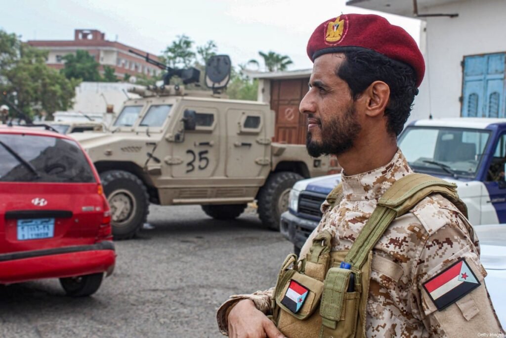 ![A fighter loyal to Yemen's Southern Transitional Council (STC) stands on guard while deployed at the entrance of Aden International Airport of the southern Yemeni city on 27 August 2020. [SALEH AL-OBEIDI/AFP via Getty Images]](https://www.middleeastmonitor.com/wp-content/uploads/2020/10/GettyImages-1228222949-1.jpg)
