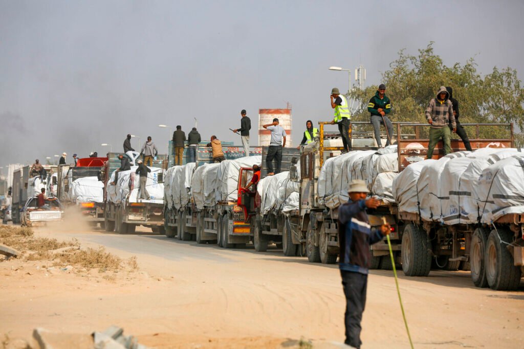 Trucks carrying food and fuel are passing through the Kissufim Border Crossing and heading towards Gaza under the ceasefire agreement between Israel and Hamas and reach the Gaza Strip in Deir al-Balah, Gaza on November 06, 2025. [Mohammed Nassar - Anadolu Agency]